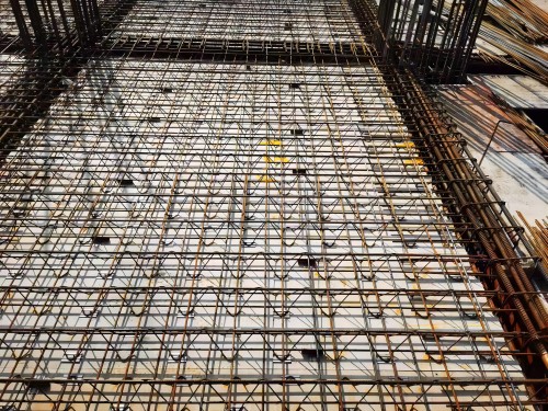 5.焊接栓釘,現(xiàn)場鋼筋綁扎,其中包括與橫架垂直方向的分布鋼筋、樓承板斷開處的連接鋼筋、柱邊加強(qiáng)鋼筋、洞口邊加強(qiáng)鋼筋。